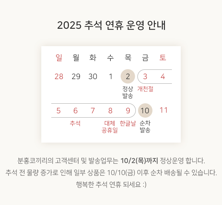 2025 Ãß¼® ¿¬ÈÞ ¹è¼Û¾È³»ÀÔ´Ï´Ù. |